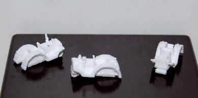 Die Räder sind hier noch einzeln angeklebt und angedeutete Achsen auch. Eine ganz schöne Fummelei. Ich habe das Modell aber digital schon geändert, so dass ich die Modelle "im Kopfstand" sozusagen komplett drucken kann. Allerdings nur die ohne Dachaufbauten. Als Letztes Modell in dieser Reihe habe ich den Samba natürlich auch druckfähig gestaltet.