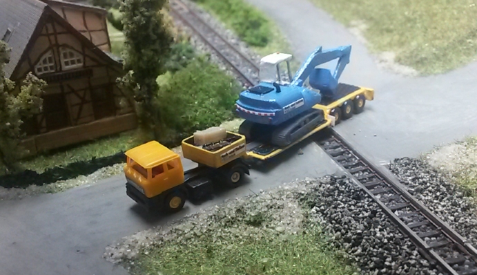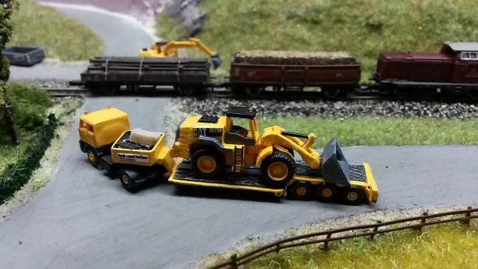 Für Dietmär Stäbler vom Stammtisch Untereschbach habe ich mich an die Gestaltung eines Schwerlasttransports gemacht. Herausgekommen ist ein 3-achsiger Tieflader, der an eine Kibri Zugmaschine passt. So kann z.B. der große Radlader CAT950M per Straßentransport zur Baustelle verbracht werden. Auch die Kettenbagger machen sich gut auf dem Tieflader.
