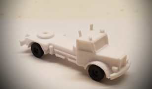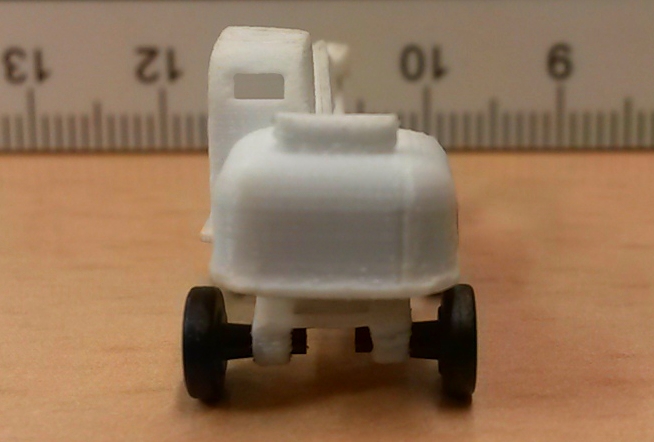 Da ich noch ein paar Kibri Fahrgestelle habe, brauchte ich noch Zugmaschinen . Ein Probedruck mit dem Führerhaus vom DL30 passte schon, aber ich habe eher an einen Opel Blitz gedacht. Das ist hier auch der erste, noch etwas unförmig, weil die Proportion ein bissel zu breit geworden ist. Das ist aber eine Kleinigkeit, das anzupassen.