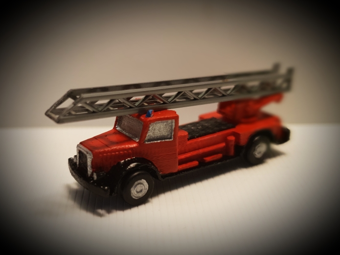 Mal wieder eine ganz neue Baustelle war die Gestaltung eines LKW. Auf die Frage eines Foristen im ZFI ob es denn Feuerwehr-Drehleitern gibt, kamen jede Menge Hinweise, dass vor Jahren Metallmodelle im Handel waren, jedoch nicht mehr hergestellt werden.