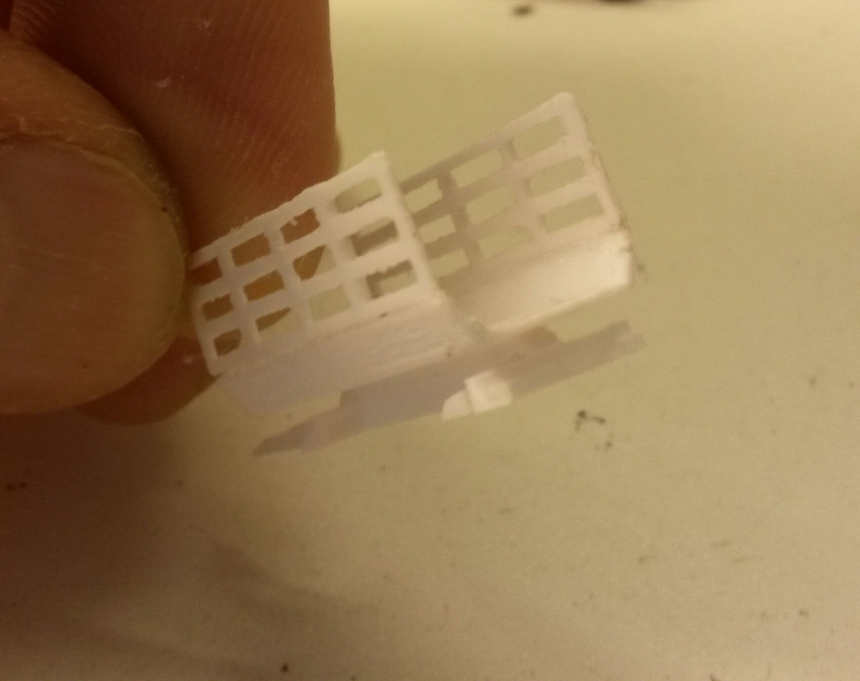 Da mir die Optik mit den Lego-Dachsteinen überhaupt nicht gefallen hat und die Dinger sowieso mit dem Dremel halbiert und beschnitten werden mussten - Tschüß Fingerkuppe... - habe ich einfach mal versucht, die Fahrerkabine gleich mit anzumodellieren. Nach einigen Versuchen mit den Schichtdicken gelang es schließlich.