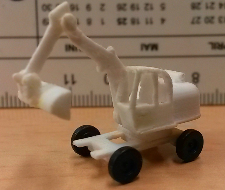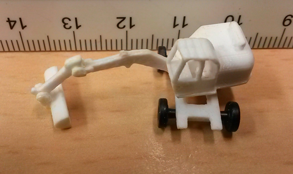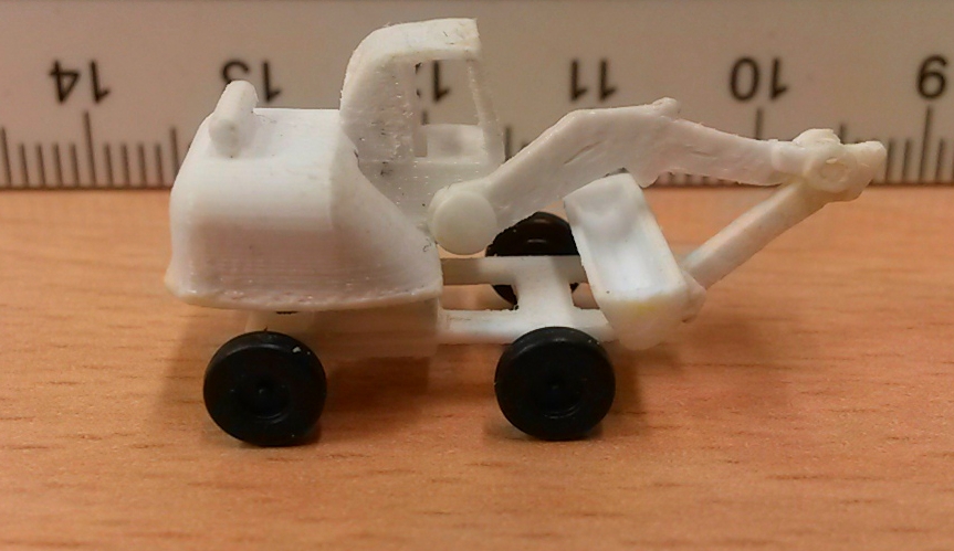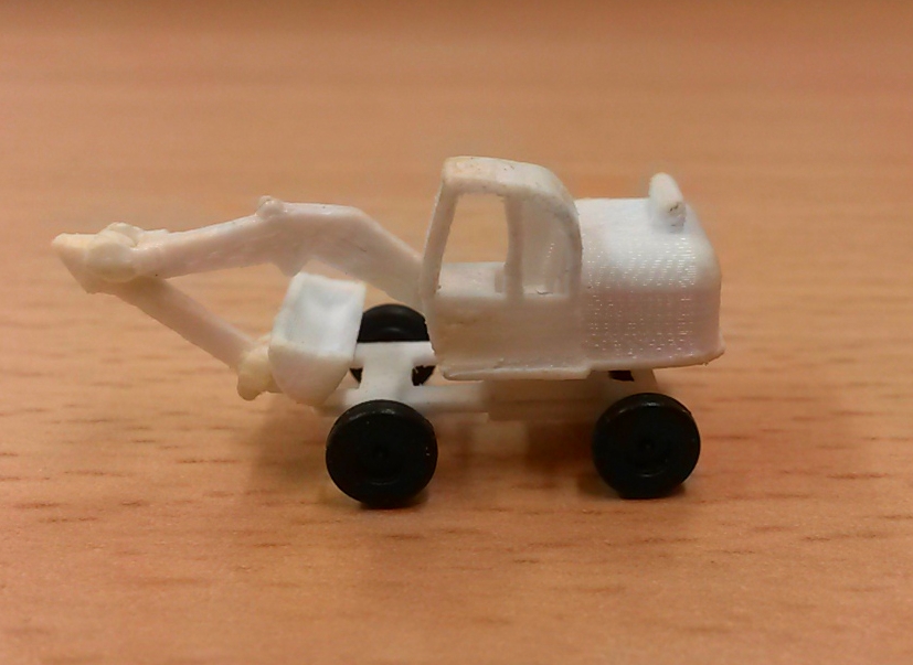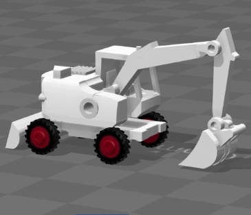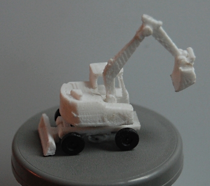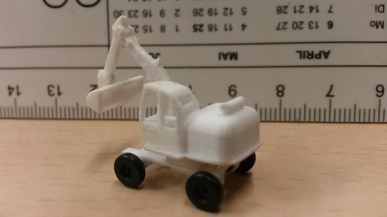 Etwas schwieriger war die Gestaltung eines kleinen Radbaggers. Hierfür habe ich die Chassisvorlagen des CAT Baggers verwendet und es in Höhe und Breite angepasst. Auch der Ausleger musste gekürzt werden. Das Modell ist nun sehr filigran geworden und die Beweglichkeit ist auch gegeben. Das Fahrgestell hat Achsaufnahmen für die Räder, die nur knappe 0,75 mm im Durchmesser sind.