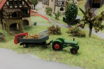 Bild 1 : noch nicht ganz fertig, es fehlen noch ein paar Kleinigkeiten wie die Zierlinien und das Modell muss noch versiegelt werden, damit es nicht so matt rüberkommt.( Der Anhänger hat jetzt auch eine passende Strohladung ) Bild 2: Ganz gut sieht man die Proportion zu dem Feldarbeiter hinter dem Traktor.