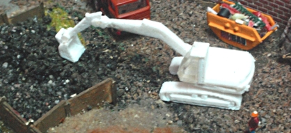 Beim Vergleich mit dem Vorbild stellte ich fest, dass es wohl eher unter der Kategorie "Midi"Bagger anzusiedeln ist. Den Ausleger habe ich dann in verschiedenen Positionen neu gestaltet. Als nächstes kommen noch imitierte Hydraulikkolben an den Ausleger.