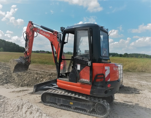 Wie oben angekündigt, sollte auch ein Minibagger entstehen. Da ich nicht viel Zeit hatte, um das Modell nach einem bestimmten Vorbild zu gestalten, habe ich kurzerhand vorhandene Bauteile etwas angepasst. Mit etwas Fantasie kann man sich einen Kubota Minibagger vorstellen.