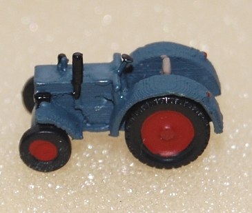 Als Vorlage diente zunächst das Modell "MB Trac 1000", der in den Jahren 1982 - 1992 gebaut wurde. Das relativ kleine Vorbild mit einer Länge von 4,48 m, wäre im Z-Maßstab knappe 20 mm lang, was bei der Planung wegen der Kabine etwas schwierig war. Unter Beibehaltung der Proportionen ergab sich eine längere Version von ca. 21 mm, die im Druck gut zu realisieren ist. Allerdings gelang es leider nicht, die Kabine offen zu drucken, sondern als geschlossenes Bauteil. Die Fensterflächen sind vertieft und gesilbert, was meiner Meinung nach auch nicht schlecht aussieht.
