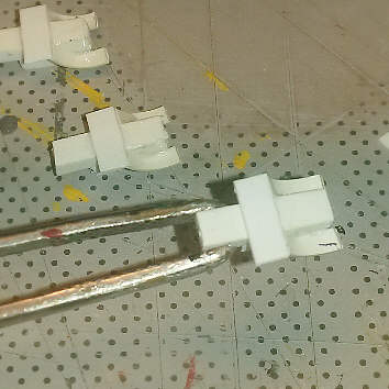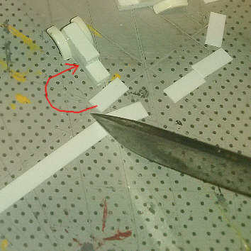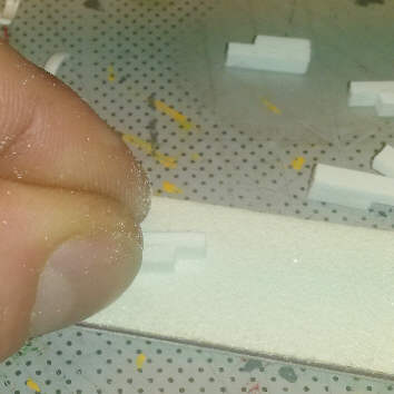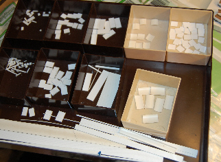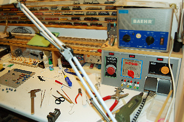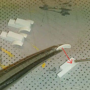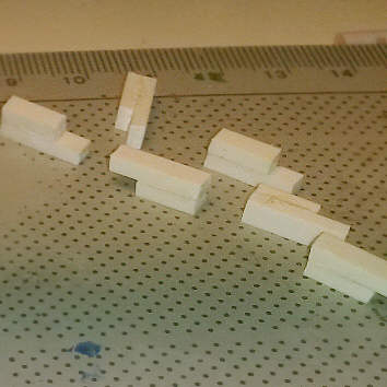Auf der Werkbank wird dann gespachtelt, bis der Arzt kommt..... Am Schotterwerk habe ich noch eine kurze Gleisstrecke verklebt. Hierzu habe ich bei einem Stück jede zweite Schwelle herausgeschnitten, um Feldbahngleise zu imitieren. Später will ich mit dem 3-D-Drucker ein entsprechendes Modell entwerfen.