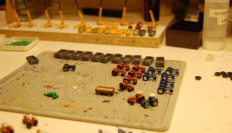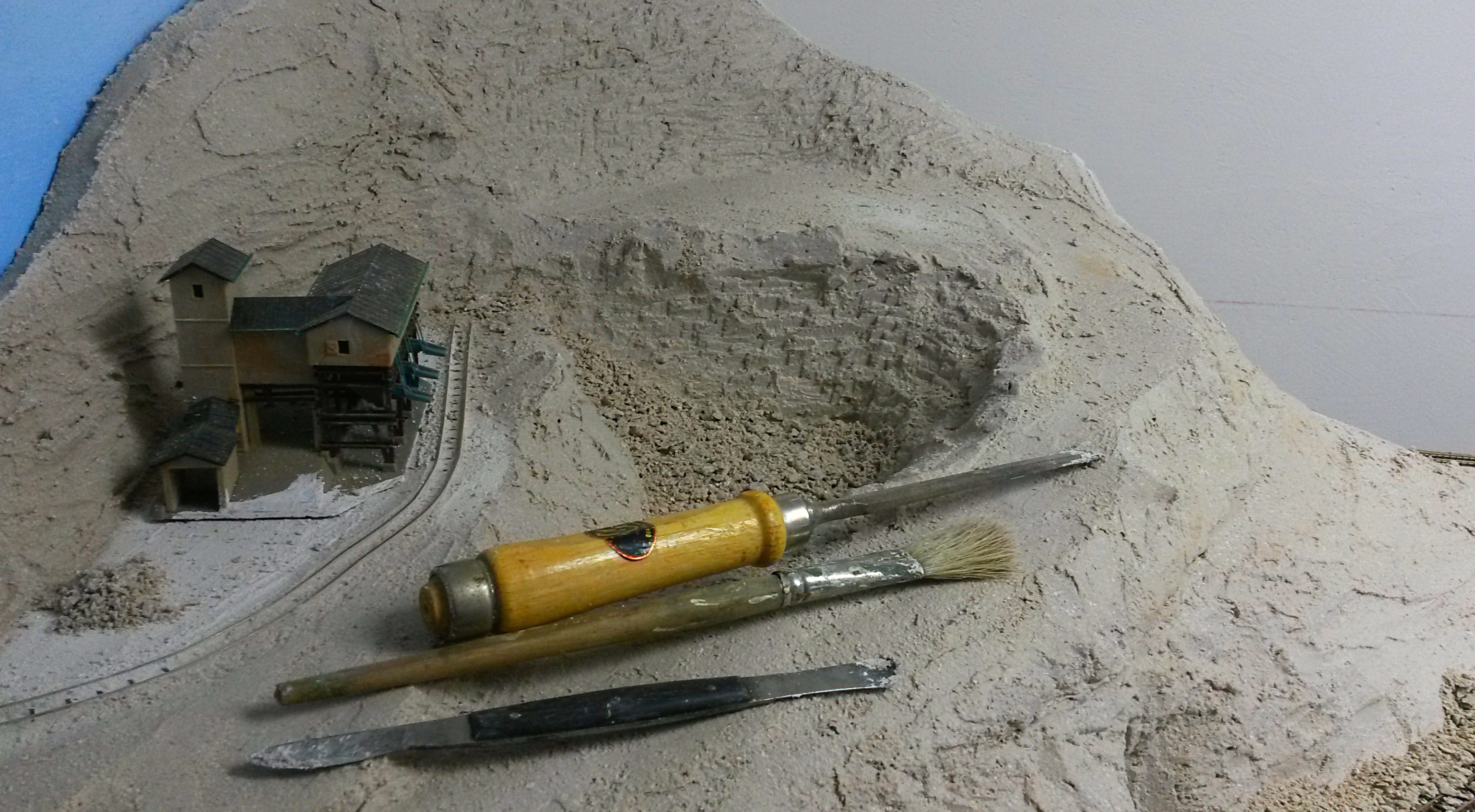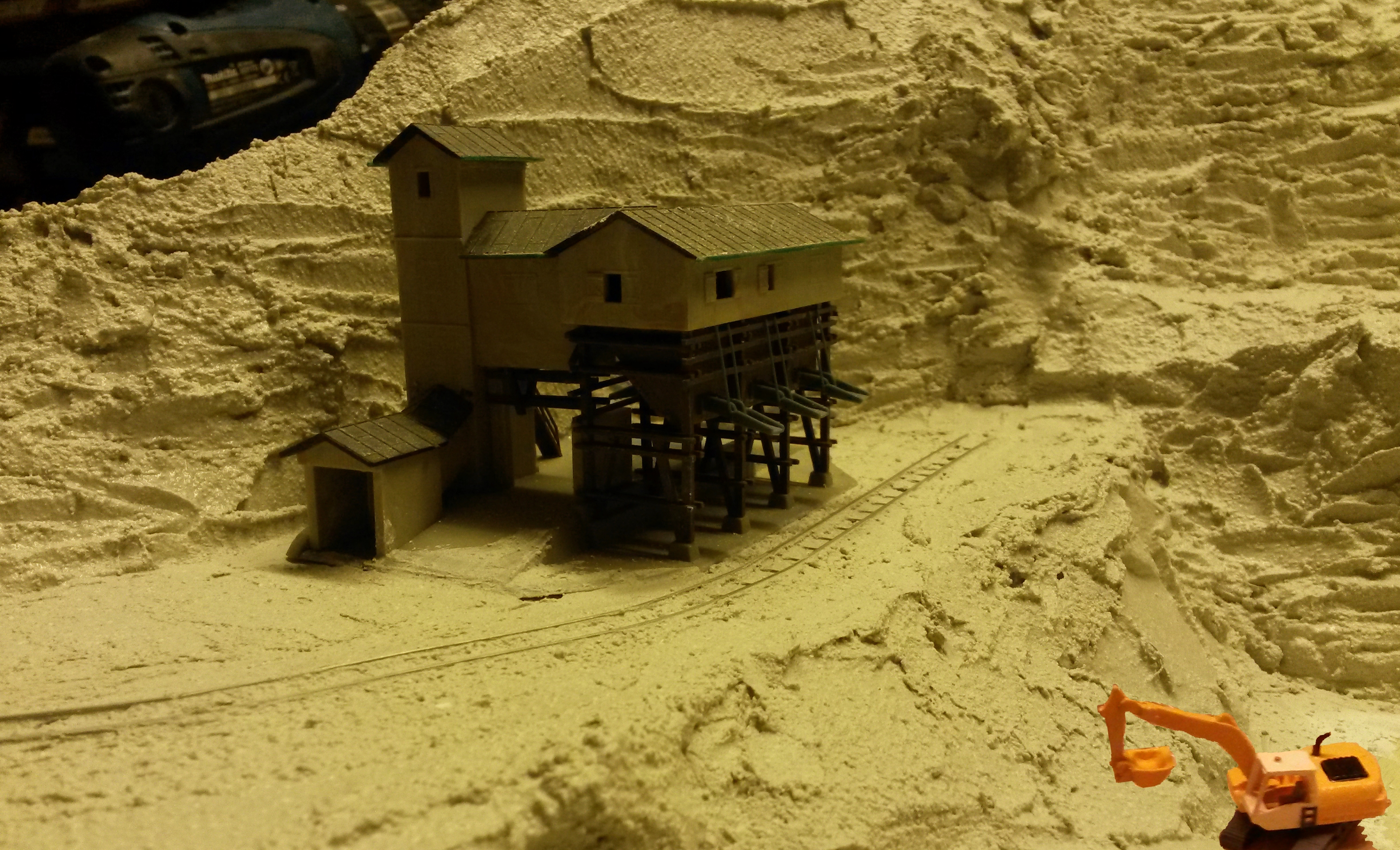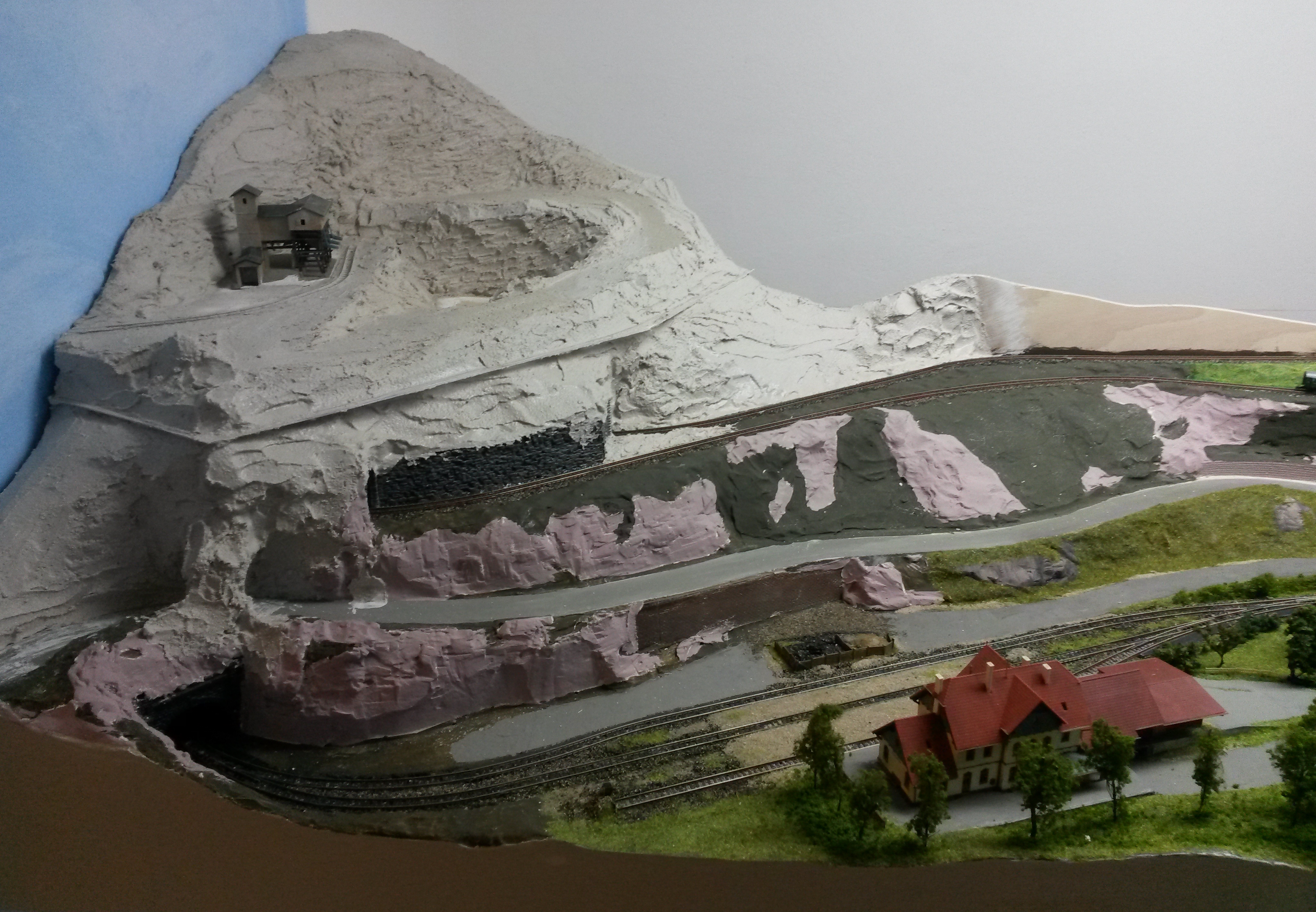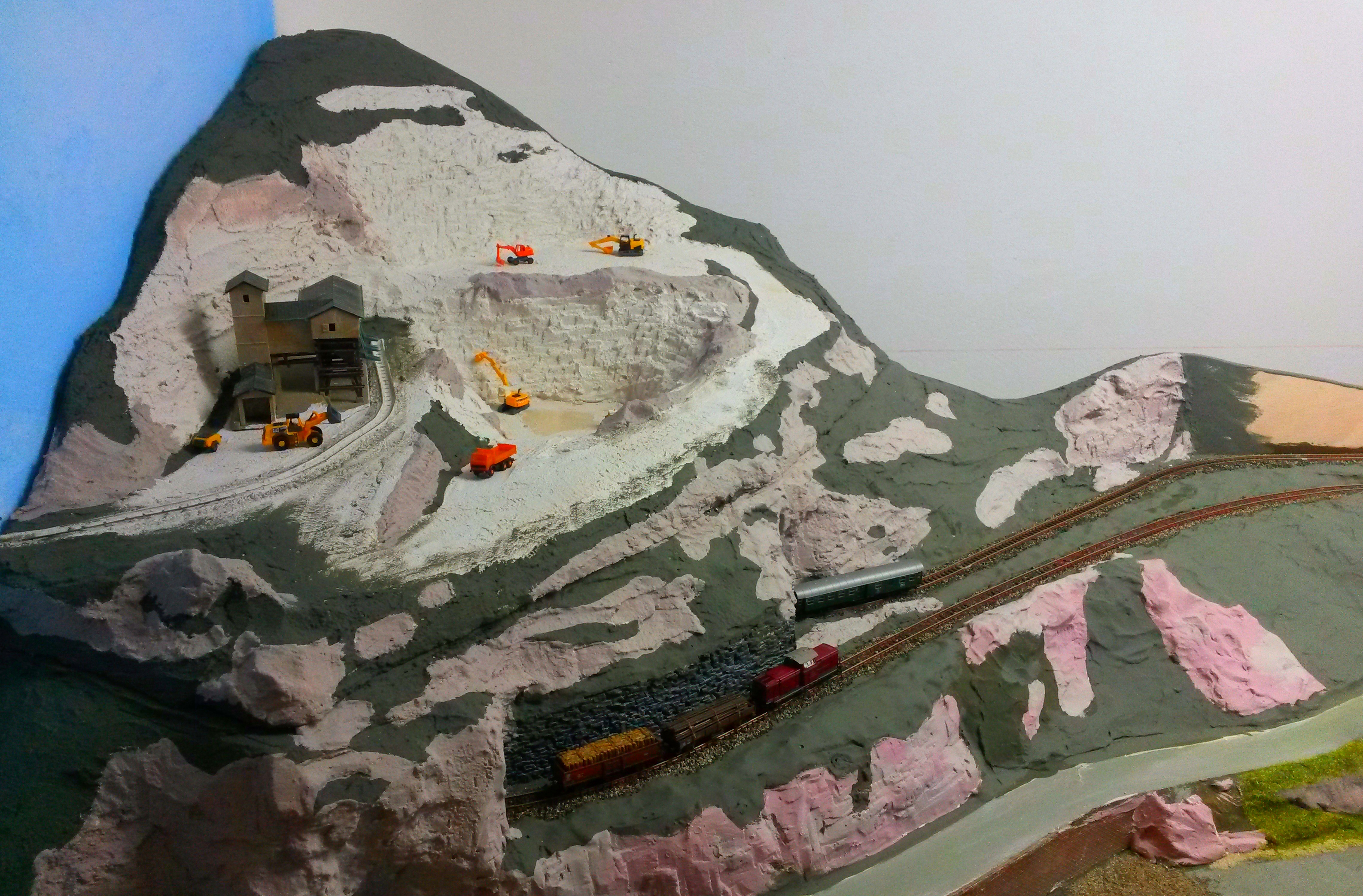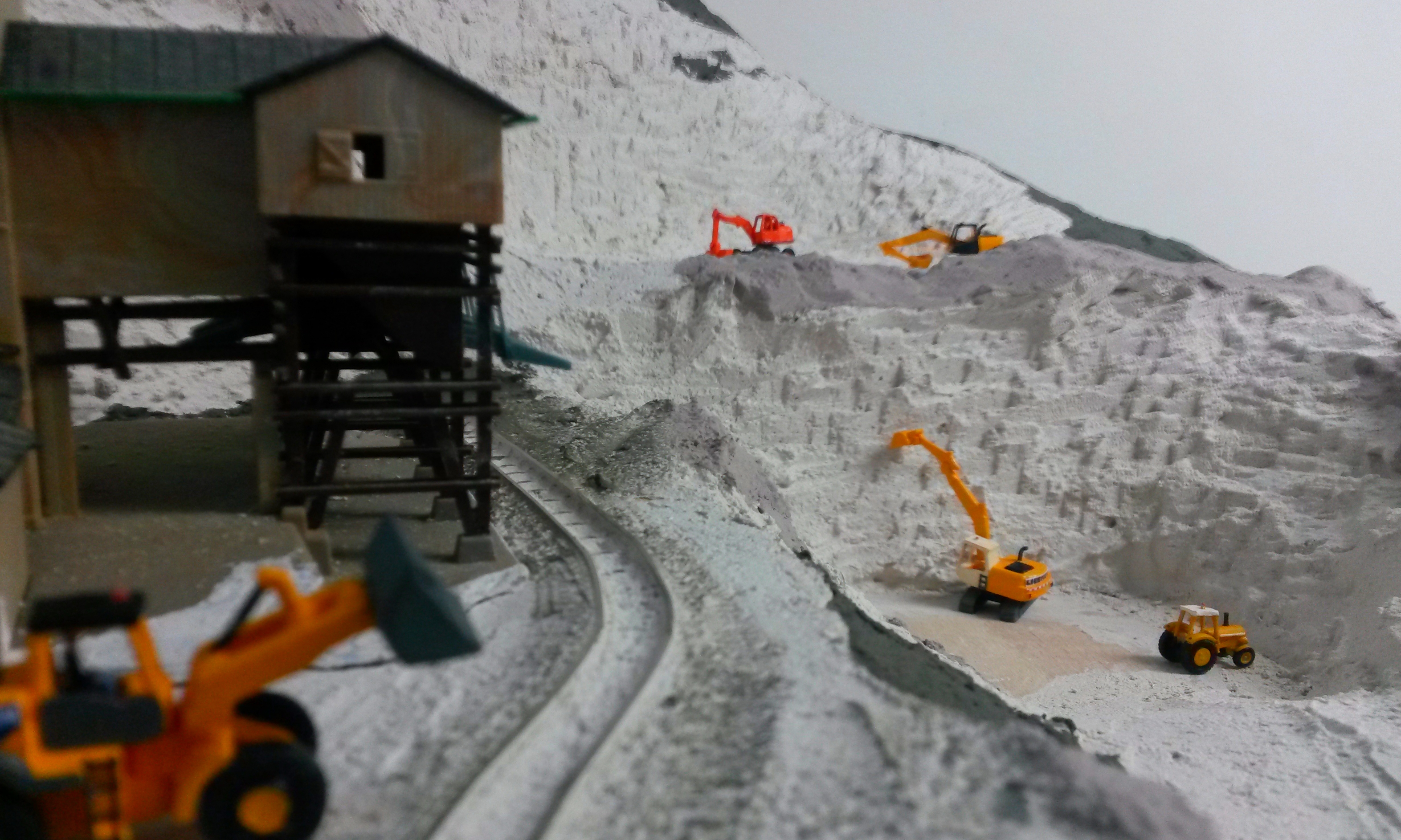 Der Steinbruchbereich wird farblich etwas anders bearbeitet, da ich Kalkstein oder Quarzit nachbilden will. Hierzu muss ich aber noch die richtige Dispersion anmischen. Die erste Stellprobe mit meinen 3-D-Modellen hingegen sieht schon mal ganz gut aus.